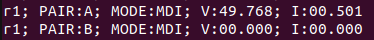 "PAIR:A; MODE:MDI, MDI, MDI; V:50.111, 49.851, 50.000; I:00.005, 00.000, 00.000; P:00.264, 00.000, 00.031;" - PAIR A parameters: